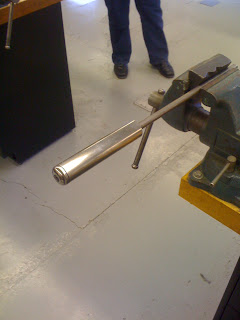 This was one of the first projects done on the brass side: unbuckling a trombone bell.  It was a lovely experience getting to know the different dent removal tools and the methodical happenings of brass work.  It all started when my instructor picked out a bell for me and proceeded to throw it on the floor and against the table repeatedly.  I was handed this warped piece of brass and this is what happened....